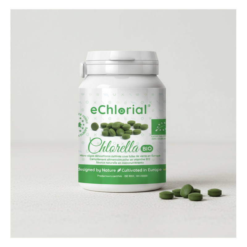 Boîte de Chlorella Premium eChlorial spécialement conçu pour les 1ers utilisateurs de chlorella. Pour commencer en douceur, voici un plan progressif sur 4 semaines avec votre boîte de 90 comprimés. Durant la première semaine, prenez 2 comprimés par jour afin d'habituer votre organisme, ce qui représente 14 comprimés. La deuxième semaine, passez à 3 comprimés par jour, soit 21 comprimés consommés. La troisième semaine, augmentez à 5 comprimés par jour pour un total de 35 comprimés. Enfin, lors de la quatrième et dernière semaine, atteignez la dose cible de 6 comprimés par jour (3 grammes par jour), ce qui représente les 20 comprimés restants sur environ 3 à 4 jours, avant de poursuivre à ce rythme avec une offre d'essai (2 x 100g, plus intéressante en prix) ou bien une boite de 350g.